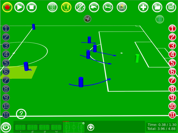 Quand on commence le tracé du mouvement d'un joueur, la ligne rouge permet de voir si le joueur se déplace pendant toute la durée de l'étape. Si le déplacement s'arrête avant que le ligne rouge a atteint la fin de l'étape, le joueur marquera une pause dans son déplacement.